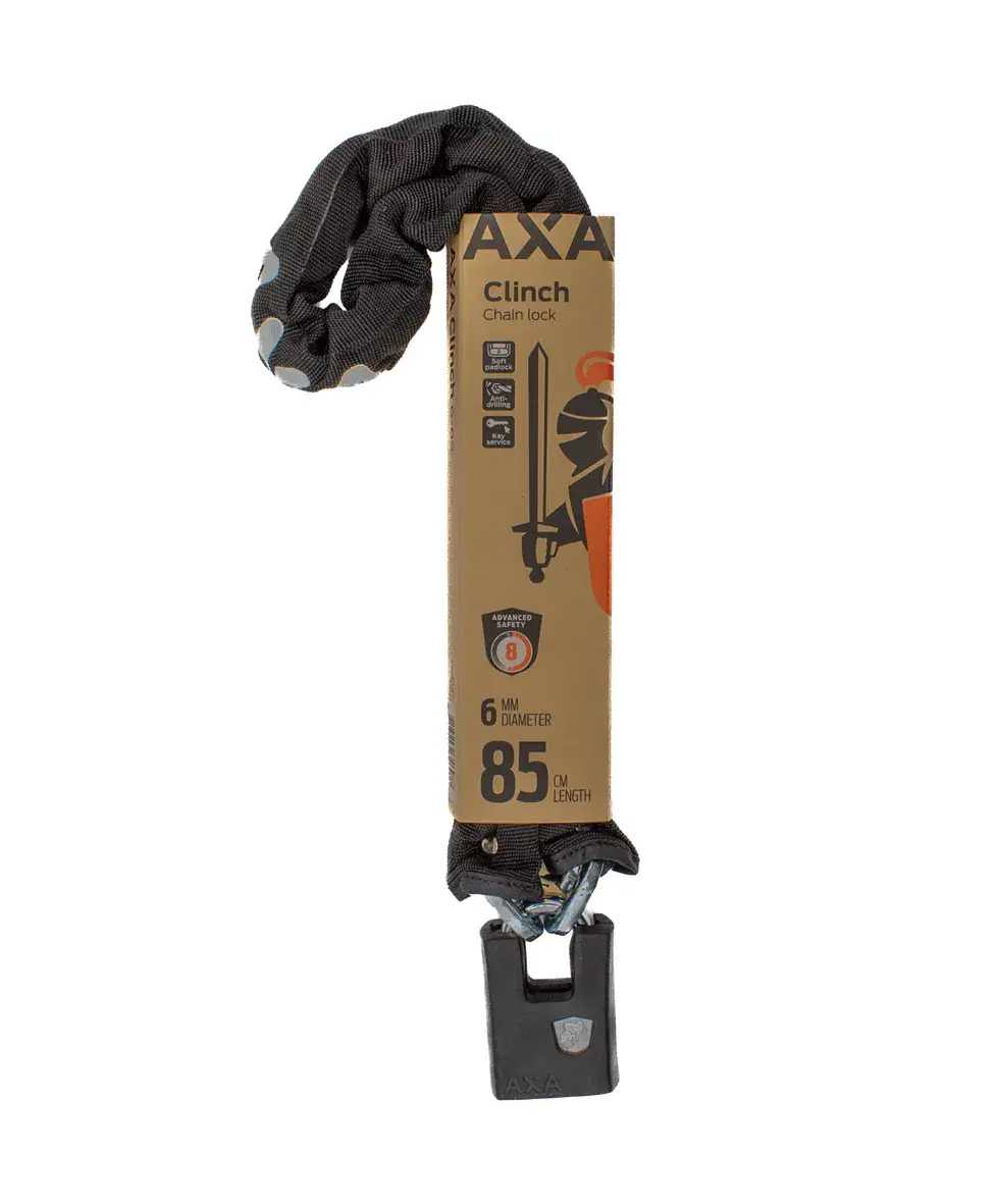 AXA Clinch+ 85 je kvalitní řetězový zámek s vyšší bezpečnostní úrovní. Odolnost Řetěz z tvrzené oceli o průměru 6 mm nabízí vysokou odolnost proti mechanickému poškození a zvládne řeznou sílu až 35 kN. Bezpečnostní úroveň 8 zaručuje spolehlivou ochranu v běžně rizikových lokalitách. Cylindr je navíc chráněn proti odvrtání. Šetrný k rámu, příjemný na použití Samostatný visací zámek s gumovým krytem a silný polyesterový návlek na řetězu chrání rám kola před poškrábáním a poškozením laku. Symetrický klíč umožňuje pohodlné odemykání z obou stran a zámek je tak velmi uživatelsky přívětivý. Praktická délka a univerzální využití S délkou 85 cm nabízí zámek dostatek prostoru pro snadné uzamčení kola ke stojanu, sloupku nebo zábradlí. Černé provedení s nerezovým vzhledem visacího zámku působí nenápadně a hodí se ke každému kolu. Hlavní výhody zámku Bezpečnostní úroveň 8 Řetěz z tvrzené oceli Ø 6 mm Odolnost proti řezání až 35 kN Ochrana proti odvrtání cylindru Polyesterový návlek a gumový kryt proti poškození rámu Vhodný jako hlavní i doplňkový zámek Technické specifikace Délka zámku: 85 cm Průměr článků: 6 mm Typ zamykání: klíč Počet klíčů: 2 Barva: černá Hmotnost: cca 1120 g