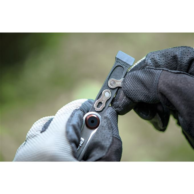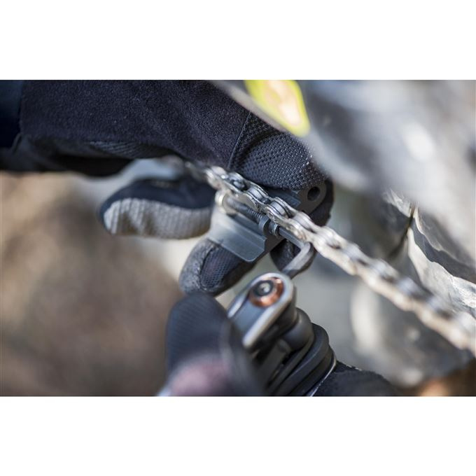 Kompaktní sada 18 nářadí s unikátním nástrojem na rozpojení zatuhlých rychlospojek řetězu a úložištěm pro náhradní rychlospojku. Obsahuje inbusy 2; 2,5; 3; 4; 5; 6; 8 mm • šroubovák • torx 25 a 30 • nýtovačka (kompatibilní i s 12ti rychlostním řetězem) • oddělovač brzdových destiček
