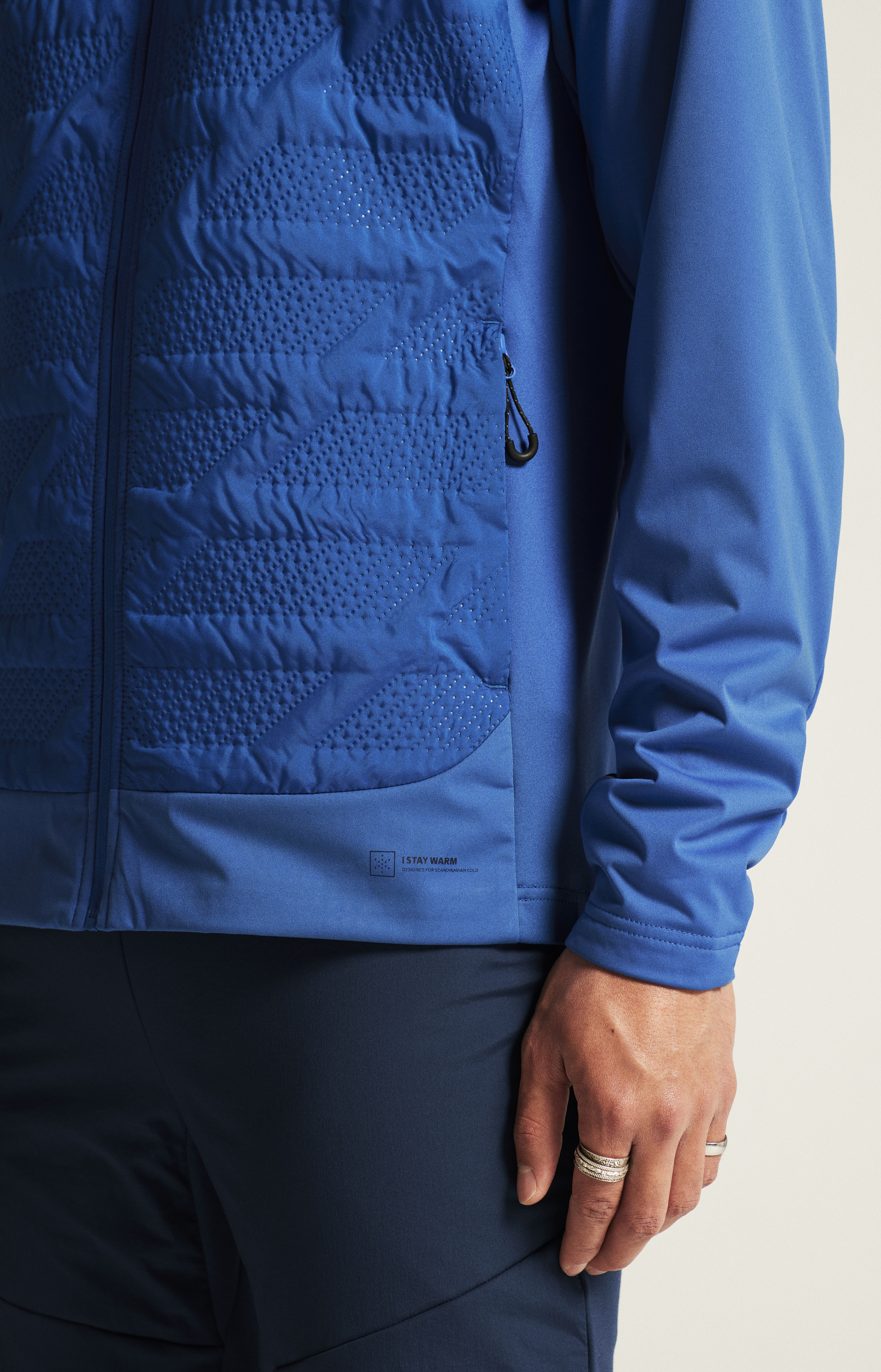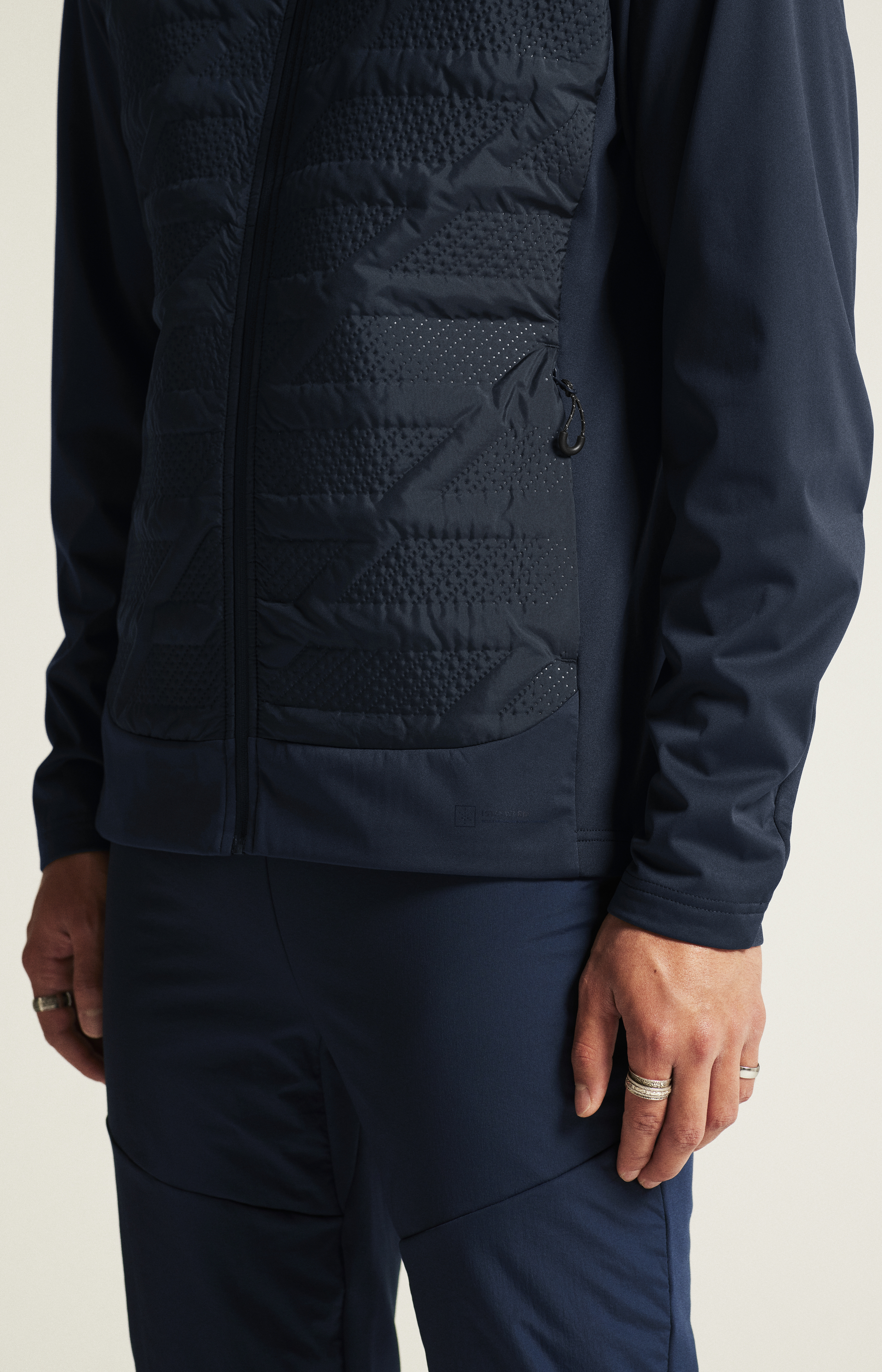 Materiál: Svrchní vrstva - 100% polyester, rukávy - 100% recyklovaný polyester, spodní vrstva - 88% recyklovaný polyester, 12% elastan; Podšívka - 100% recyklovaný polyester