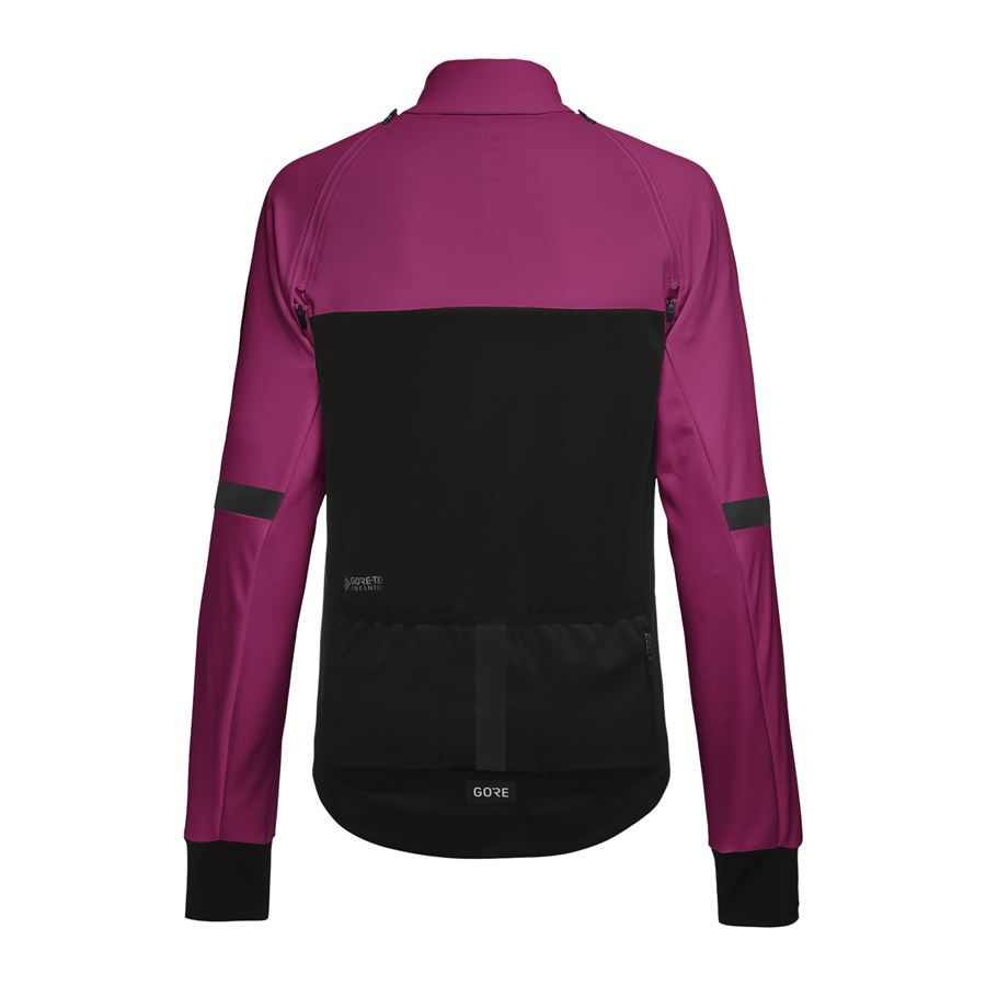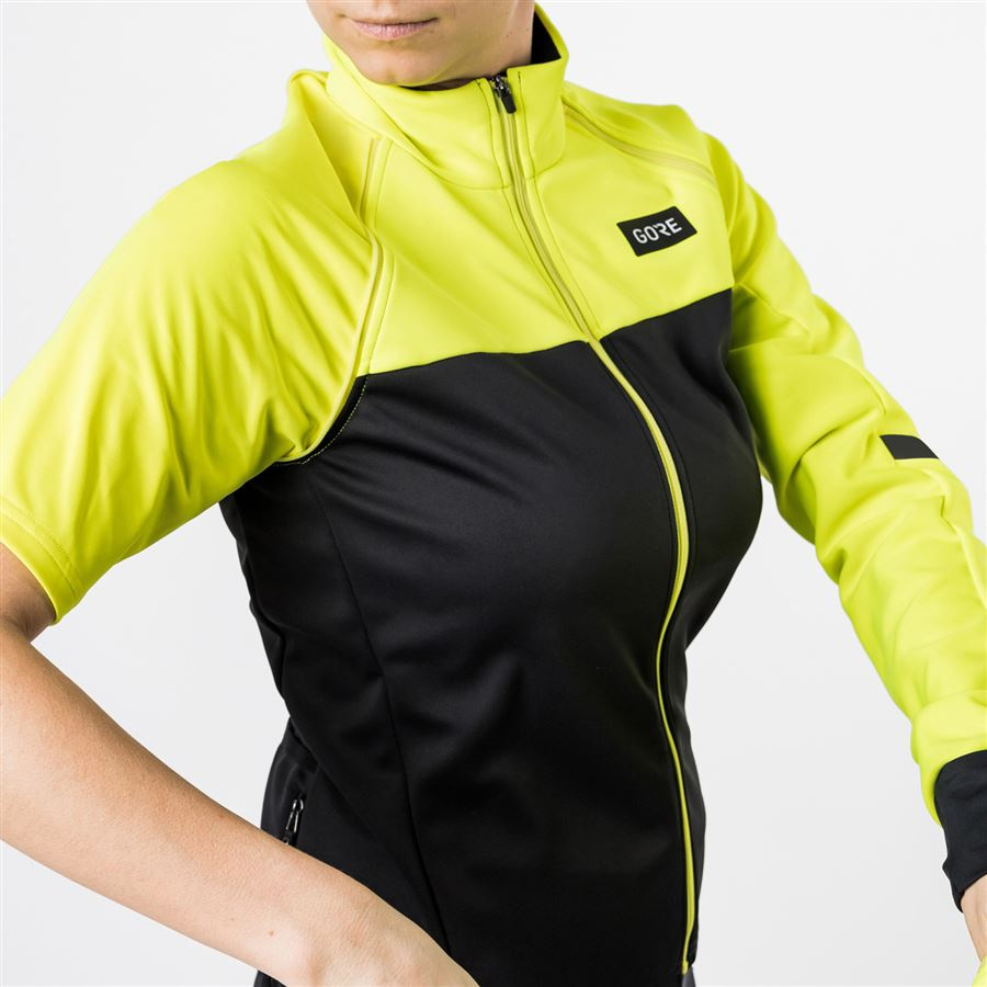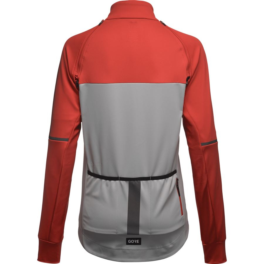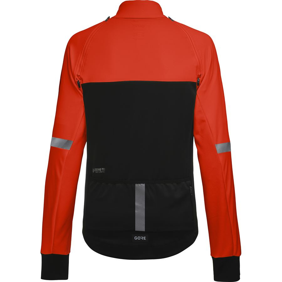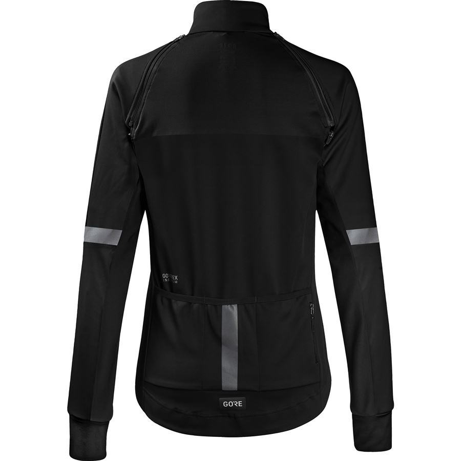 VLASTNOSTI A MATERIÁLY Tkaniny GORE-TEX INFINIUM™ s technologií membrán GORE® WINDSTOPPER®: zcela větruodolná, extrémně prodyšná a odolná vůči lehčímu dešti Speciální cyklistický střih s prodlouženými zády Odnímatelné raglánové rukávy Přiléhavý vysoký límec Pružná guma na vnitřní straně zadního pasu pro bezpečné uchycení bundy a zabránění vyhrnování Tříkomorová zadní kapsa s kapsičkou na zip Reflexní detaily Hmotnost: 434g