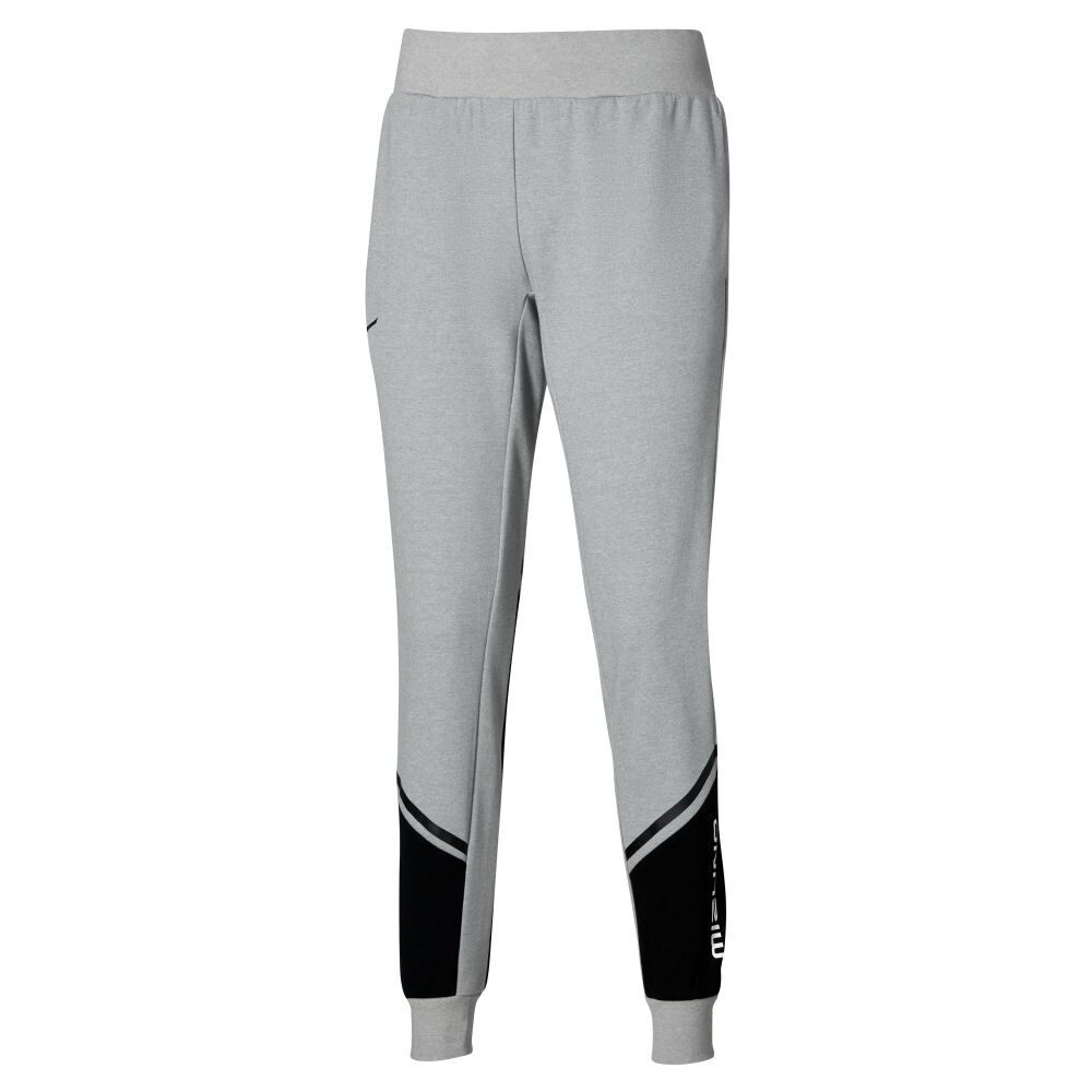 Bavlněné tepláky klasického střihu. Kontrastní barevnost dolní části nohavic a nápis Mizuno na levé nohavici. Dvě otevřené boční kapsy