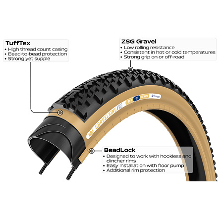 Plášť GravelKing X1 nabízí nejnižší valivý odpor a zároveň nejagresivnější design běhounu v řadě Gravelking, takže poskytuje bezkonkurenční výkon napříč všemožnými podmínkami. Budoucnost všestranných gravel pneumatik přichází. ZSG gravel přilnavá směs s nízkým valivým odporem konzistentní při vysokých i nízkých teplotách vysoká přilnavost na silnici i v terénu Tufftex skvělá ochrana proti defektu po celé ploše od patky k patce odolnost a pružnost BeadLock snadná istalace dodatečná ochrana ráfku tubeless ready Product code Size ETRTO Tread Color Sidewall color Weight(g) Recommended inflation pressure(kPa) Recommended inflation pressure(PSI) RF735-GKX1-B2 700×35C 35-622 Black Brown 420 TLR: MAX 400/TUBED: MAX 525 TLR: MAX 60/TUBED: MAX 75 RF735-GKX1-D2 700×35C 35-622 Black Brown 420 TLR: MAX 400/TUBED: MAX 525 TLR: MAX 60/TUBED: MAX 75 RF740-GKX1-B2 700×40C 40-622 Black Black 480 TLR: MAX 400/TUBED: MAX 525 TLR: MAX 60/TUBED: MAX 75 RF740-GKX1-D2 700×40C 40-622 Black Brown 480 TLR: MAX 400/TUBED: MAX 525 TLR: MAX 60/TUBED: MAX 75 RF745-GKX1-B2 700×45C 45-622 Black Black 560 MAX 400 MAX 60 RF745-GKX1-D2 700×45C 45-622 Black Brown 560 MAX 400 MAX 60
