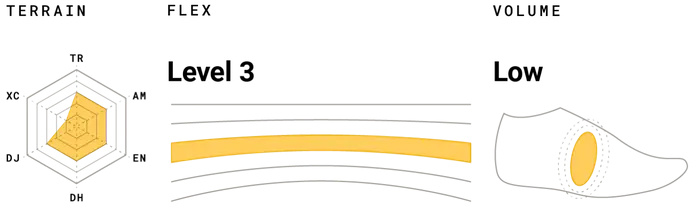 Evergreen v nabídce Ride Concepts v uplně nové generaci. Takový Freerider od RC. Zapracovalo se na všem co jen šlo a výsledkem je bota s maximálním pohodlím, ochranou a efektivním přenosem síly do pedálu. Dle hesla RC “ride every day”, Livewire jsou ideální pro každodenní kombinaci kola a běžného chození. Model je ideální pro trail, slopestyle, nezávodní enduro. Určen pro platformové pedály. Dámské modely nejsou obyčejnou kopií pánských modelů. Značka RC si uvědomuje rozdíly ve stavbě těla ženy, muže i dítěte a proto jsou dámské modely vyvíjeny samostatně. Takže kompletně celá bota má jiné rozměry ve všech směrech, ale samozřejmě i odlišnou tuhost konstrukce včetně podrážky. Stylové bavy jsou samozřejmostí. Nová generace přichází i s novým svrchním materiálem, který je odolnější, ale zároveň prodyšnější i lehčí než jeho semišový předchůdce. Navíc je celá pata a vnitřní část kotníku vyvedena v novém materiálu, který se neodře/nevydře o rám či kliky kola. Kontrukce modelu Livewire je shodná s modelem Vice, kde podrážka plynule přechází ve svršek a spojení je zajištěno kombinací svařování a prošívání. Zatímco modely Tallac, Hellion, Accomplice, Transition atd. používají odlišnou konstrukci tvřenou v pořadí podrážka, mezipodešev a svršek. Ta je totiž vhodnější pro více výkonově zaměřené jezdce. Špička i pata jsou speciálně chráněny integrovaným TPU chráničem. Svrchní část je zase opatřena úpravou proti okopání a prodření. Super přidanou hodnotou je vnitřní vložka chránící oblast paty a došlapu prstů pomocí vstřikované EVA pěny. Chodidlo je tak méně unavené a náchylné k obraženinám. Utahování pomocí protiskluzových tkaniček. Jazyk má na sobě očko pro uschování tkaniček, aby se volně nepohybovaly a nemohlo dojít kontaktu s kolem či zachycení o překážku. Podrážka High Grip nabízí perfektní poměr mezi gripem a odolností. High Grip je dominantou modelů Vice, Vice Mid a Livewire. Existuje i přilnavější směs Max Grip (Tallac, Hellion, Accomplice, Transition atd), ale ta se ukázala jako příliš přilnavá pro kategorie jezdců, pro které je Livewire určen a navíc pro slopestylově zaměřené jezdce je tak přilnavá, že nedovoluje pracovat s chodidlem při náročných tricích. Směs podrážky High Grip ve tvaru šestihranu EVA Dual Density vložka tlumí nárazy a brání úrazu Protiskluzové tkaničky s očkem na jazyku pro jejich přichycení Antibakteriální podšívka ze síťoviny pro eliminaci zápachu Jazyk přichycený ke konstrukci drží na svém místě a zabraňuje vnikání nečistot TPU ochrana špičky a paty se zesílenou vrstvou proti oděru Vnější ochrana proti odření v oblasti špičky, paty a vnitřního kotníku
