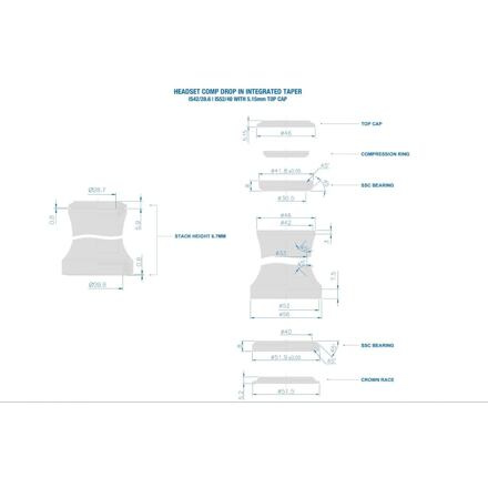 Integrované hlavové složení Ritchey Comp. Material: steel Stack Height: 6.8mm (1 ⅛”) / 6.7mm, 16.6mm (1 1.5" tapared)  Stack height upper: 6mm (1 ⅛”) / 5.15mm, 15.3mm (1 1.5" tapared)  Stack height lower: 0.8mm (1 ⅛”) / 1.55mm, 1.3mm (1 1.5" tapared)  Headtube ID upper: 42mm Headtube ID lower: 42, 52mm S.H.I.S. upper: IS42/28.6 (1 ⅛”) S.H.I.S. lower: IS42/30 (1 ⅛”), IS52/40 (1.5")   Bearings semi-cartridge (SSC) Weight: 75g (1 ⅛”) Color: black