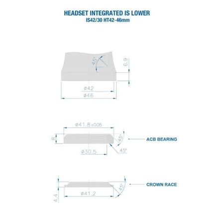 Spodní část integrovaného hlavového složení.  Material: alloy Stack Height: zero Headtube ID: 42, 47, 52mm S.H.I.S.: IS42/30  (1 ⅛”), IS47/33 (1 ¼”), IS52/40 (1.5")   IS42/30 (1⅛") bearing41.8/30.5/8mm 45°/45° - sealed cartridge (ACB) – titanium coated IS47/33 (1 ¼”) bearing41.8/34.1/8mm 45°/45° - sealed cartridge (ACB) – titanium coated IS52/40 (1.5") bearing51.9/40/8mm 45°/45° - sealed cartridge (ACB) – titanium coated Weight: 30g Color: black