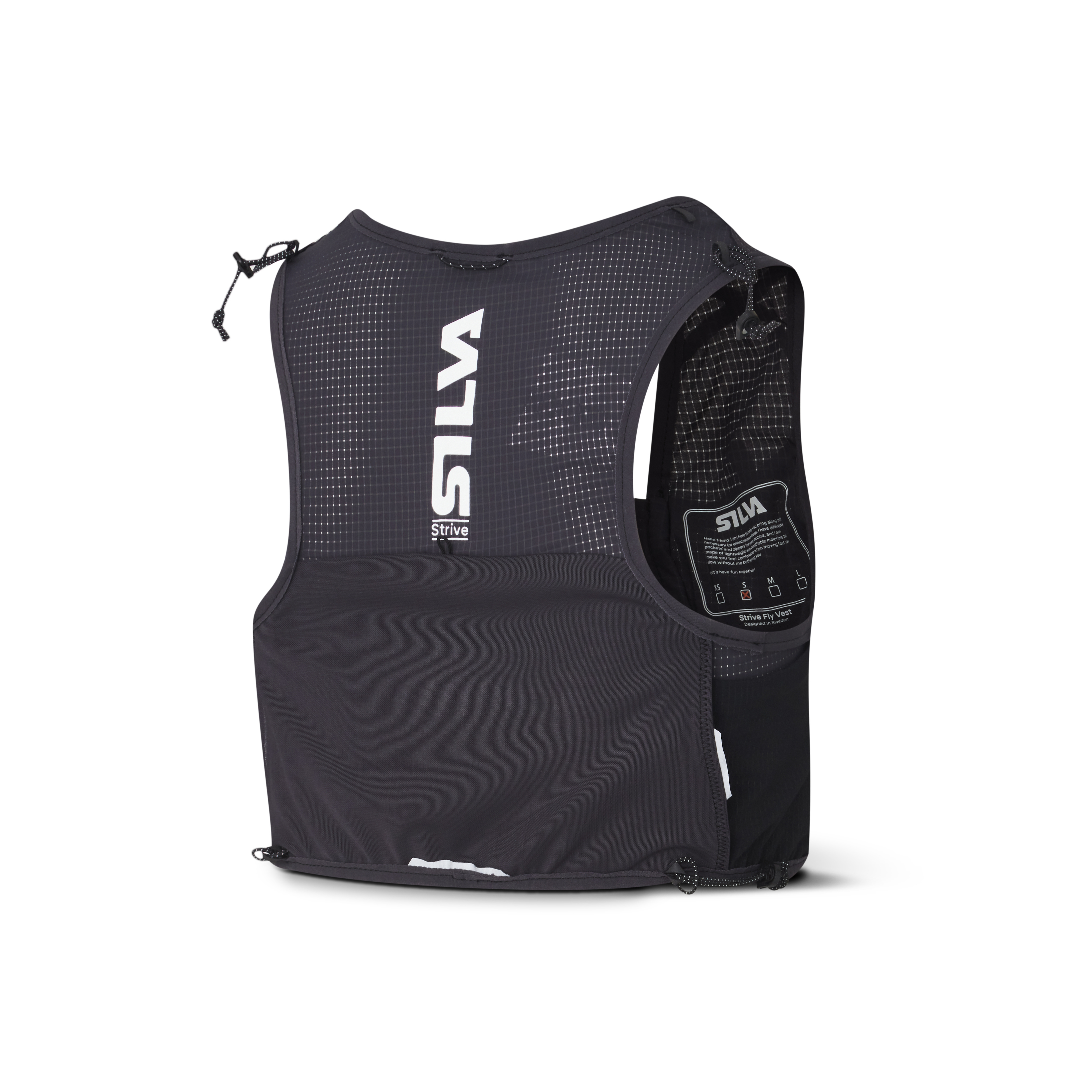 Běhej nebo leť s ultralehkou vestou Silva Strive Fly o hmotnosti pouhých 113g (vel. XS). Je vyrobena z měkkého lehkého ripstop nylonu a prodyšné síťoviny, je vybavena mnoha chytrými kapsami a elastickými poutky pro přichycení běžeckých holí. Na přední straně má vesta dvě kapsy na láhve o objemu 500ml (dodávají se samostatně) a menší kapsy na tyčinky, gely a jiné drobnosti. Jedna z čelních kapes je zipová s háčkem na klíče. Na bocích jsou dvě kapsy a na zádech je ve spodní části podélná kapsa přístupná z obou stran. Vesta je vybavena nouzovou píšťalkou a reflexními prvky.