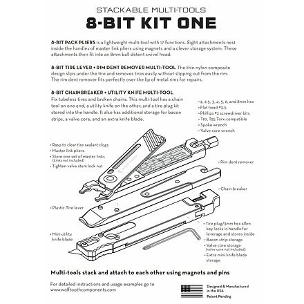 Zbrusu nové nářadí z řady 8-Bit One kombinuje tři samostatné části do unikátního stavebnicového systému. Je jen na vás jaký typ a kolik možností klíčů chcete vozit. Dohromady můžete být vybaveni až 22mi nástroji pro opravy nejčastějších mechanických problémů. Buďte připraveni na nástrahy a pokračujte bezpečně dále na vaší cestě za dobrodružstvím. Celé nářadí je lehké (171g) a dobře skladovatelné. Díky preciznímu zpracování máte záruku pevnosti, přesnosti a dlouhé životnosti. Troufáme si tvrdit, že jde o poslední nářadí na kolo, jaké si za život koupíte. Další už jednoduše potřebovat nebudete. K dostání po samostatných částech anebo rovnou v kompletním balení. Stávající generace 8-BIT kleští je plně kombinovatelná s montpákou a nýtovačem téže řady. Celý systém se skládá ze tří hlavních dílů, jež můžete do sebe zacvaknout pomocí magnetů a pinů. Utvoříte tak kompaktní celek pro snadný transport a skladování. 8-BIT kleště Tento klíč už dobře znáte. Kleště na rychlospojky řetězu a matky ventilků s úschovnou částí pro bity různých velikostí. Dohromady nabízí neuvěřitelných 17 funkcí. Snadná manipulace a velká páka pro povolení x utažení šroubů s velkým utahovacím momentem. Schránka na náhradní rychlospojku řetězu. Vše zajištěno magnety proti vypadení. 8 - BIT montpáka Dlouhá ergonomická montpáka obsahující i rovnačku ohnutých patek ráfku. Slouží jako propojovací článek mezi kleštěmi a nýtovačem. 8 - BIT nýtovač Druhý hlavní „protikus“ nářadí. Obsahuje nýtovač řetězu, pinzetu na knoty, univerzální nožík a schránku na náhradní knoty, ventilek a břity do nože.