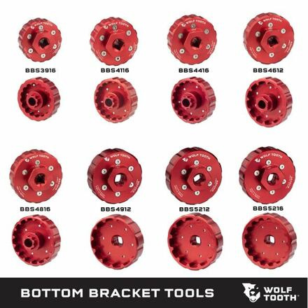 Stahovák středového složení použitelný s klasickou palcovou ráčnou nebo s Wolf Tooth klíčem Pack wrench, číslo produktu: PACKWRENCH BBS3916: 16 notch BB socket for 39mm diameter notch pattern, Shimano 9000 series, DURA-ACE, BB92, XTR BB93 BBS4116: 16 notch BB socket for 41mm diameter notch pattern, Shimano 105, Ultegra BBR60 and 6800, XT MT-800 BBS4416: 16 notch BB socket for 44mm diameter notch pattern, Shimano BB80, BB5700, BB70, BB51, Enduro T47, Wheels T47, many from Hollowtech II, Campagnolo, Chris King, FSA MegaExo, Hope, SRAM/Truvativ GXP, Race Face X-type, Surly, and more BBS4612: 12 notch BB socket for 46mm diameter notch pattern, BB386, Race Face 30mm Spindle, TF47, SRAM DUB, RaceFace Cinch, Zipp Vuma, Rotor BSA30, Hawk Racing BB3086, Cane Creek Hellbender, and more. BBS4816: 16 notch BB socket for 48mm diameter notch pattern, FSA 386 MegaEvo, Wheels PF30, BSA30, BB386, and more BBS4912: 12 notch BB socket for Praxis T47IB BBS5212: 16 notch BB socket for Chris King T47 BBS5216: 16 notch BB socket for DUB T47 Weight: BBS3916 • 73g | BBS4116 • 70g | BBS4416 • 74g | BBS4612 • 78g | BBS4816 • 79g | BBS4912 • 66g | BBS5212 • 83g | BBS5216 • 85g Material: 7075-T6 aluminum Made in the USA